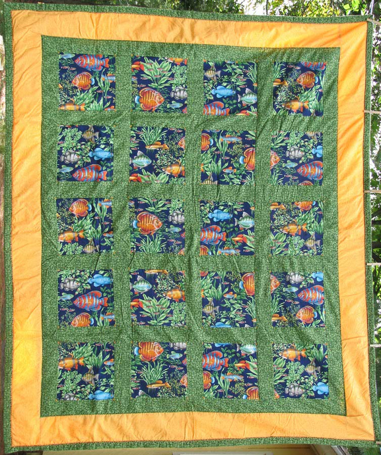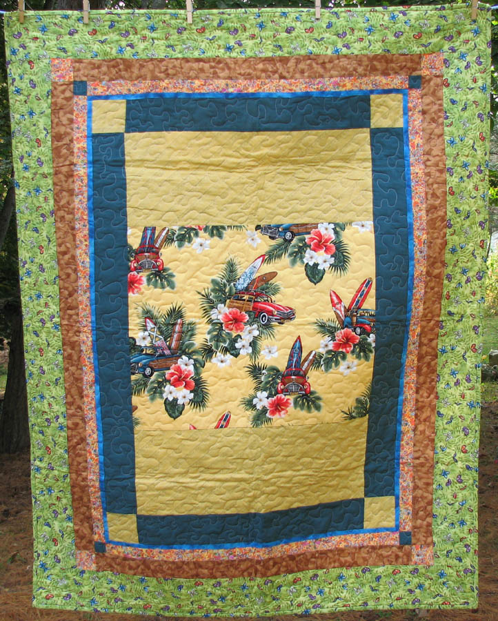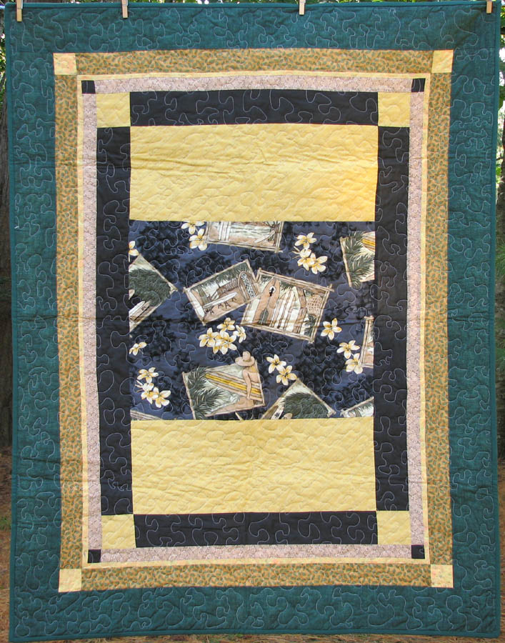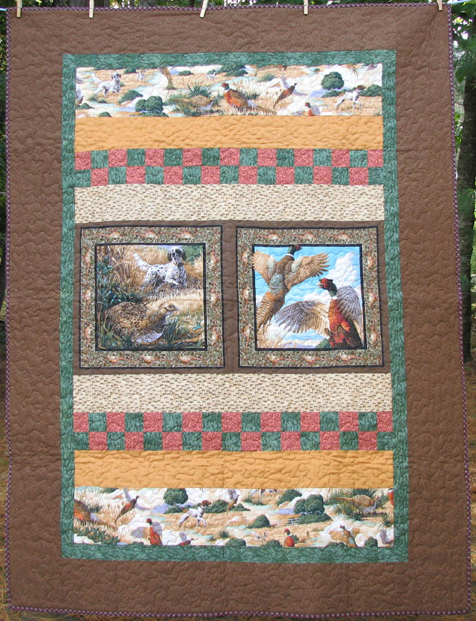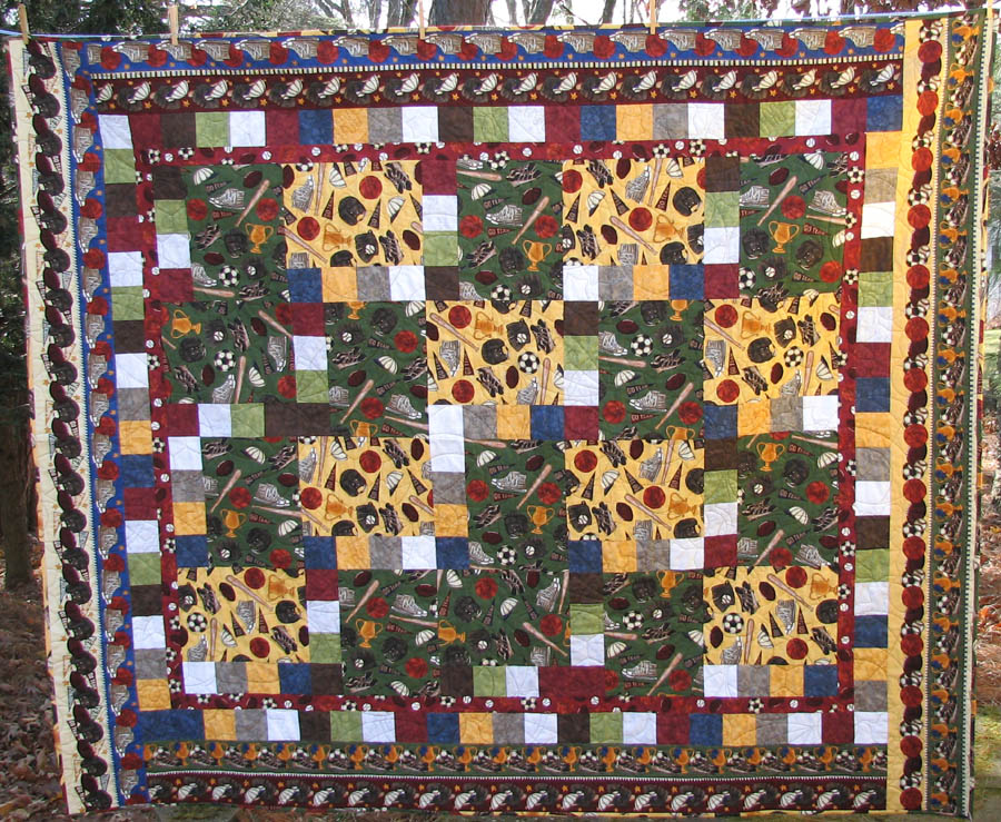 The quilt Linda C. made for Jeff is called “Five Friends Gone Fishing” honoring the friends who went to watch the 5th friend running in the Boston Marathon. The quilt represents friendship, fishing, camping, lakes, woods and wildlife.
