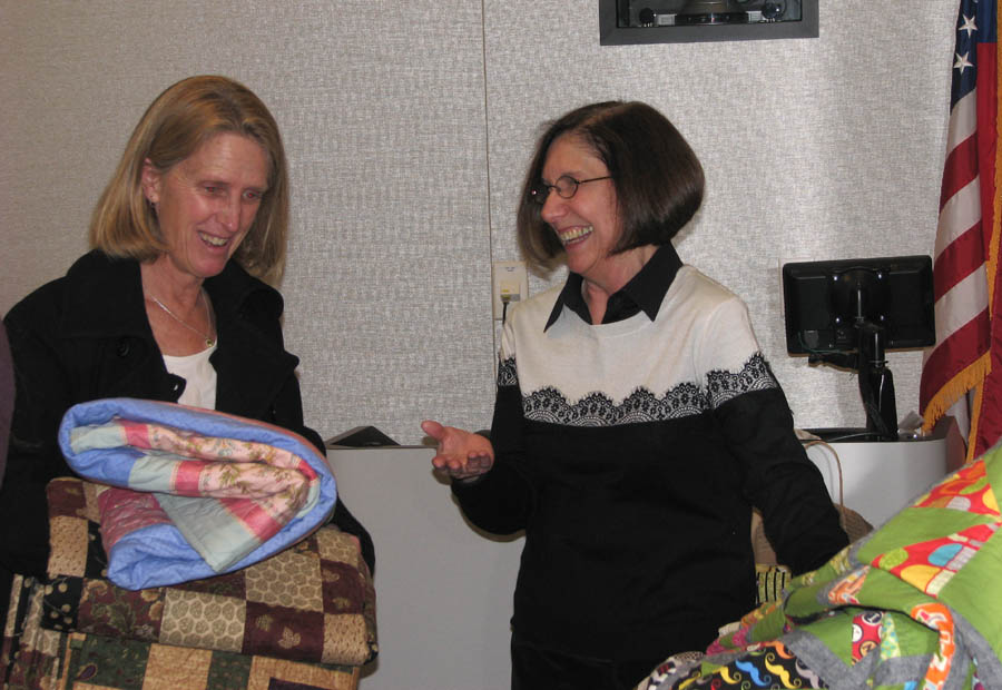 Laura Sexton and Judy White display the quilts they dropped off at The Quilted Crow in Boxborough, MA.